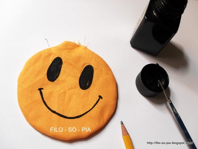 Se voglio usare colore per stoffa e pennellino, la tinta risulterà più scura e resistente, ma il lavoro sarà più lungo e difficile. In questa foto si vede un'altra versione della medaglia: cucita a rovescio e riportata a diritto da un'apertura di circa 2 cm. Dopo la pittura del sorriso, verrà imbottita, inserito il filo di cotone e, infine, chiusa con pochi punti a mano.