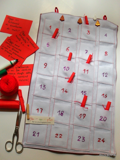 E per ultimo...tutto bianco e tutto in pannolenci, rinforzato da un cotone rosso scuro che fa da retro (facoltativo). Le taschine, piuttosto piccole, sono ritagliate una per una e poi cucite con filo rosso. Per i numeri ho usato ancora la colla glitter rossa e viola. Sta bene anche appeso a una sola asola che pende da un lato.Dentro ogni taschina un bigliettino rosso fuoco con messaggi da scoprire giorno dopo giorno fino a Natale! Con lo spirito dei bigliettini, si può creare un calendario a tema anche come pensiero simpatico per noi adulti, ecco qualche esempio: