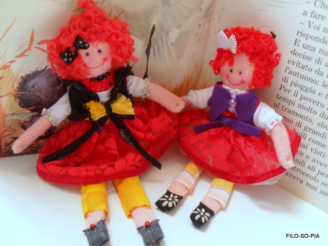 Il resto è venuto da solo, un po' di lana per i capelli, due perline minuscole per gli occhi, un ricamo per la bocca e piccoli ritagli di stoffa e pannolenci per confezionare i vestiti. In grande libertà e fantasia e con il piacere di ritornare per un po' ai ricordi d'infanzia.