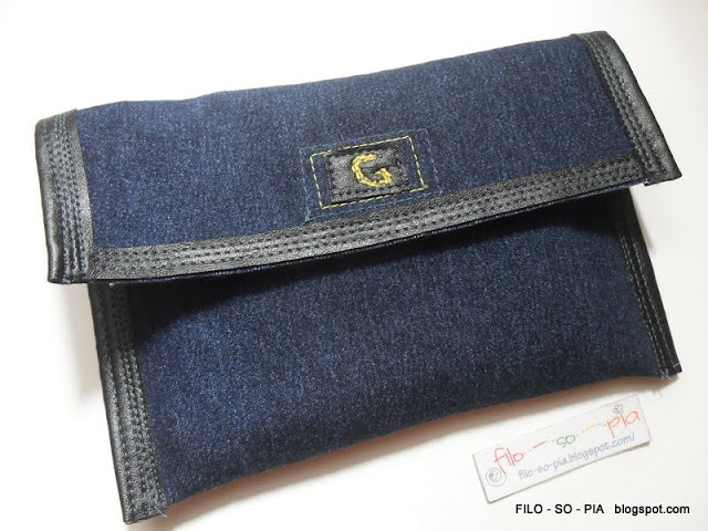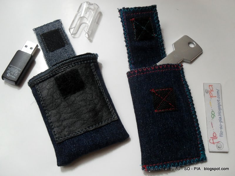 Il più grande è fatto con un rettangolo ricavato dai resti di una gamba e orlato con qualche ritaglio di eco pelle nera riciclata. È una busta molto semplice che si chiude con due pezzettini di pratico velcro. In questi modelli è importante ricordarsi di cucire la parte inferiore del velcro, prima di fare le cuciture laterali, altrimenti potremo farlo solo a mano.