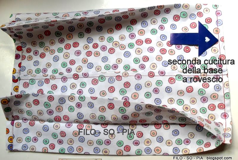 I primi passi per la confezione di questa borsa, li trovate cliccando qui. Arrivati al passo 4, la prima cucitura  questa volta la facciamo sul diritto del lavoro e non sul rovescio (vedi freccia blu)La cucitura inglese  vuole la prima cucitura sul diritto.